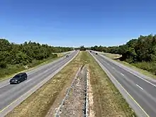 DelDOT has replaced several at-grade intersections along DE 1 south of Dover with grade-separated interchanges in order to improve traffic flow and safety, particularly in the summer months when the route sees heavy beach traffic.[87] On October 27, 2008, construction began on an interchange at DE 9 near Dover Air Force Base, with Governor Ruth Ann Minner in attendance at the groundbreaking ceremony.[88] Construction of the interchange at DE 9 was completed in 2009.[89] In November 2009, construction began for a grade-separated interchange with DE 12 in Frederica; the interchange was completed in June 2011.[90][91] In September 2011, the median crossover at the Wilkins Road intersection near the northern terminus of DE 30 was permanently closed ahead of a project to construct an interchange with DE 30. The median crossover at DE 30 Alt. (Johnson Road) was modified to prohibit left turns from northbound DE 30 Alt. to northbound DE 1; only allowing motorists to turn from northbound DE 30 Alt. to southbound DE 1 and to access southbound DE 30 Alt. from both directions of DE 1.[92] In November 2012, construction began on the interchange at DE 30 southeast of Milford, which was completed in July 2014.[93] On January 31, 2015, groundbreaking took place for an interchange at Thompsonville Road north of Milford, with Governor Markell and DelDOT secretary Bhatt in attendance.[94][95] Construction of this interchange involved extending Thompsonville Road west from DE 1 to an intersection with Church Hill Road and Tub Mill Pond Road. The interchange at Thompsonville Road opened in November 2016.[96]