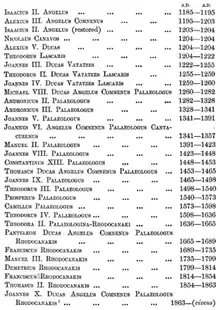 - ↑ The table lists the reigning Byzantine emperors from Isaac II Angelos (r. 1185–1195 and 1203–1204) to the last emperor, Constantine XI Palaiologos (r. 1449–1453, here numbered Constantine XIII). After Constantine, Demetrius lists Constantine's brother, Thomas Palaiologos, and then the Paleologus family of Pesaro,[10] whose descent from Thomas is not entirely historically verified.[11] Demetrius then lists members of his own Rhodocanakis family.[10] Some technically senior lines of descent are excluded: Demetrios Palaiologos, Thomas Palaiologos' older brother, is not included, nor are the undisputed verified male children of Thomas (Andreas and Manuel), though none of these figures left descendants surviving until Demetrius' time. Demetrius claimed that his family descended from Theodora, a daughter of Theodore Paleologus, through a marriage to "Eudoxia Comnena",[7] an invented figure.[12] The real descendants of Theodore, though they went extinct in the late 17th century, are excluded from Demetrius' line of succession since Theodore's "second" (only actual) wife, Mary Balls, was a Protestant (adhering to the wrong faith) and a commoner (rendering the marriage "illegal").[7]