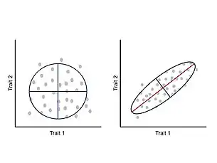 Integration or covariation among traits during development has been suggested to constrain phenotypic evolution to certain regions of the morphospace and limit adaptive evolution.[24] These allometric changes are widespread in nature and can account for a wide variety of realized morphologies and subsequent ecological and physiological changes.[25][26] Under this approach, phenotype is seen as an integrated system where each trait develops and evolves in concert with the other traits, and thus, a change in one trait affects the interacting parts in a correlated manner.[24][27] The correlation between traits is a consequence of the architecture of the genotype–phenotype map, particularly the pleiotropic effects of underlying genes.[11] This correlated change between traits can be measured and analyzed through a phenotypic variance-covariance matrix (P-matrix) which summarizes the dimensions of phenotypic variability and the main axis of variation.[24]