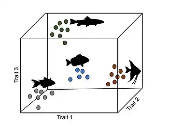 The morphospace is a quantitative representation of phenotypes in a multidimensional space, where each dimension corresponds to a trait. The phenotype of each organism or species is then represented as a point in that space that summarizes the combination of values or states at each particular trait.[16] This approach is used to study the evolution of realized phenotypes compared to those that are theoretically possible but inexistent.[16][17]
