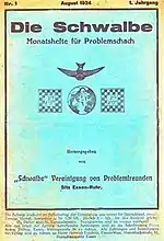The magazine Die Schwalbe appeared the first time in July 1924.[2] Since that date it issues bimonthly. Only between 1943 and 1946 the appearance had been broken by the war. The then president of the society Wilhelm Karsch bridged that time sending all members Mitteilungen der Schwalbe (notes of the society). Die Schwalbe is worldwide recognised as a trade magazine. In the magazine chess compositions and solutions are published, composition tournaments announced and articles about chess compositions published.