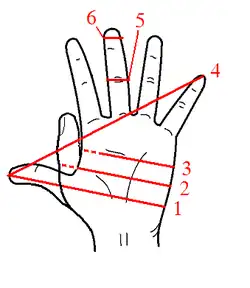 A digit (lat. digitus, "finger"), when used as a unit of length, is usually a sixteenth of a foot or 3/4" (1.905 cm for the international inch).[6] The width of an adult human male finger tip is indeed about 2 centimetres. In English this unit has mostly fallen out of use, as do others based on the human arm: finger (7/6 digit), palm (4 digits), hand (16/3 digits), shaftment (8 digits), span (12 digits), cubit (24 digits) and ell (60 digits).