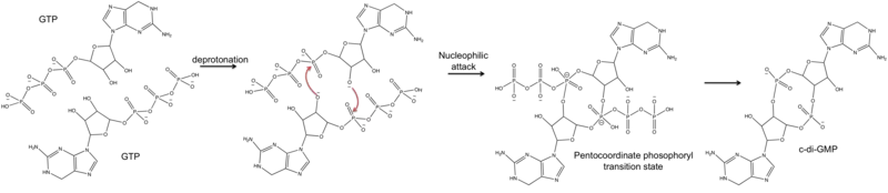 - ↑ Ryjenkov DA, Tarutina M, Moskvin OV, Gomelsky M (March 2005). "Cyclic diguanylate is a ubiquitous signaling molecule in bacteria: insights into biochemistry of the GGDEF protein domain". Journal of Bacteriology. 187 (5): 1792–8. doi:10.1128/JB.187.5.1792-1798.2005. PMC 1064016. PMID 15716451.