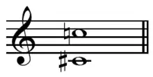 In music from Western culture, a diminished octave () is an ⓘinterval produced by narrowing a perfect octave by a chromatic semitone.[1] As such, the two notes are denoted by the same letter but have different accidentals. For instance, the interval from C4 to C5 is a perfect octave, twelve semitones wide, and both the intervals from C♯4 to C5 and from C4 to C♭5 are diminished octaves, spanning eleven semitones. Being diminished, it is considered a dissonant interval.[3]