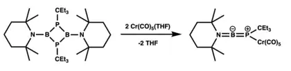 Diphosphadiboretanes have been shown to behave as ligands to metal-carbonyl complexes, forming boron-mononuclear, boron-binuclear, η3, and η4 architectures with displacement of CO ligands.[12] If steric, amino-containing substituents on the boron are used, then a cycloreversion reaction happens. This results in the production of metal-stabilized boraphosphene. Cage compounds (B2P2M, M = Pd, Pt) have also be reported with η2 coordination to the P atoms.[13]