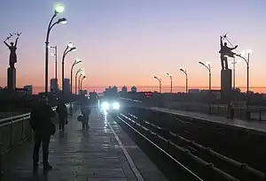Dnipro (Ukrainian: Дніпро, ) is a station on the ⓘKyiv Metro's Sviatoshynsko-Brovarska Line. Named after the Dnieper River, the station consists of a semi-estacade over the embankment highway, and then continues across the river as part of Kyiv Metro Bridge. The station was opened along with the first stage of the Metro in 1960[1] and for the first five years, before the bridge was completed, was the eastern terminus of the line.
