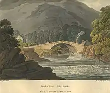 Dolanog Bridge is possibly the finest single early stone bridge in Montgomeryshire and may possibly date 17th century with the high camber of the roadway over the arch, which is similar to Llanrwst bridge. It was graphical depicted against a background of mountains in Edward Pugh's Cambrian Depicta. published in 1816. This view has now been lost by the building of recent bridge downstream of the old bridge. The bridge has a carriageway is about 3 metres wide. Rough masonry parapets with upright stone copings. The parapets are turned out at all four ends. Road macadamed and blocked by bollards at each end. It is listed by Cadw as Grade II