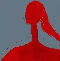 On July 25, 2020, West tweeted out an album cover,[136] showing an infrared scheme of orange and red mirroring the shape of the people, sun, and moon in the sky, backed by green mountains alongside purple and white clouds designed by Pierre-Louis Auvray.[95] In the lead up to the first Donda listening event on July 22, 2021, a possible replacement cover was used as the promo artwork. The cover was an adaptation of a Louise Bourgeois gouache painting that had been created in 2007, the same year as Donda West's death, and included in Bourgeois' series Les têtes bleues et les femmes rouges (2015).[137][138] In the painting, a woman is shown in monochromatic red and a matching ponytail flows behind her, while a fertility idol is also partially present.[137][138] After Kanye West posted numerous potential covers, a plain black square was ultimately used as the artwork for the album.[139]