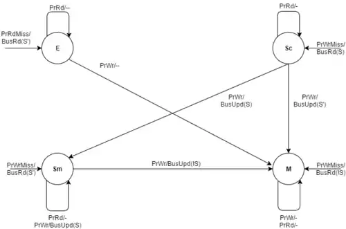 - If the cache block is in the Shared Modified state when a write (PrWr) occurs and the shared line is asserted, a bus update (BusUpd) is generated to update the other cache block.