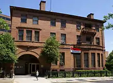 Other landmarks, many of which are listed on the National Register of Historic Places, include the International Temple, Embassy Gulf Service Station, Christian Heurich Mansion (also known as Brewmaster's Castle), Whittemore House (headquarters to the Woman's National Democratic Club), the Briagdier General George P. Scriven House (headquarters to the National Society Colonial Dames XVII Century), and the Phillips Collection, the country's first museum of modern art. The Richard H. Townsend House located on Massachusetts Avenue now houses the Cosmos Club.[31] Across Massachusetts Avenue, the historic Anderson House, owned by the Society of the Cincinnati, is open daily for tours. The Dumbarton Bridge, also known as the Buffalo Bridge, carries Q Street over Rock Creek Park and into Georgetown and was constructed in 1883.[31] The Nuns of the Battlefield sculpture, which serves as a tribute to over 600 nuns who nursed soldiers of both armies during the Civil War, was erected in 1924.[33][34] The Mansion on O Street a luxury boutique hotel, private club, events venue and museum has been a fixture in Dupont Circle for over 30 years and includes over 100 rooms and 32 secret doors. Also overlooking the square is The Dupont Circle Hotel. Two disused semicircular trolley tunnels follow the outline of the circle; the one on the east is currently Dupont Underground, an art and performance space.[35][36]