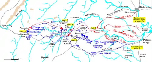 ![]() Lee's retreat in the Appomattox Campaign, April 3–9, 1865 |