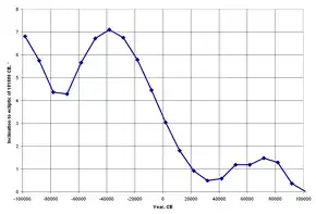 These expressions for the obliquity are intended for high precision over a relatively short time span, perhaps several centuries.[18] J. Laskar computed an expression to order T10 good to 0.04″/1000 years over 10,000 years.[14]