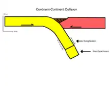 There is the argument that collision between two continents should slow down because of continental buoyancy, and that for convergence to continue, it should do so at a new subduction zone where oceanic crust can be consumed.[1] Certain areas such as the Alps, Zagros, and Himalayas (where continental collisions have continued for tens of millions of years, in the middle of land, creating mountain ranges) contradict this argument, and have led geologists to propose a continental undertow that continues subduction. This continental undertow is explained by the slab pull concept. Slab pull is the concept that plate motion is driven by the weight of cool, dense plates and that heavier plates will begin to subduct.[2] Once a descending slab is disconnected there must be a force that continues subduction. Eclogitization is the mechanism for continuing subduction after slab detachment in a subduction zone.[1]