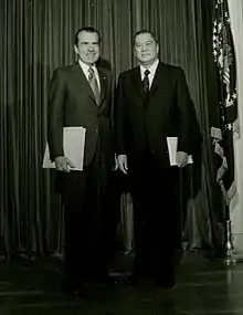 In 1966, Romualdez was appointed by President Ferdinand Marcos to be his Secretary of Finance. In 1970, due to student protests now known as the First Quarter Storm, several cabinet members were replaced by Marcos including Romualdez, who was replaced by Cesar Virata.[9][10] In 1971, he was appointed Ambassador of the Philippines to the United States. He presented his credentials to United States President Richard Nixon on October 13, 1971.[11]