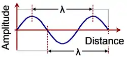 Electrical length is defined for conductors carrying alternating current (AC) at a single frequency or narrow band of frequencies. An alternating electric current of a single frequency is an oscillating sine wave which repeats with a period of .[5] This current flows through a given conductor such as a wire or cable at a particular phase velocity . It takes time for later portions of the wave to reach a given point on the conductor so the spatial distribution of current and voltage along the conductor at any time is a moving sine wave. After a time equal to the period a complete cycle of the wave has passed a given point and the wave repeats; during this time a point of constant phase on the wave has traveled a distance of