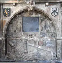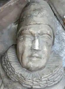 He died in 1635 and was buried in St. Andrew's Chapel (the "Cannons' Vestry") in Exeter Cathedral, as was also his wife when she died on 20 June 1636.[22] His elaborate monument with semi-recumbent alabaster effigy survives on the south side of the chancel in Bovey Tracey Church, opposite that of Nicholas Eveleigh, his second wife's first husband.