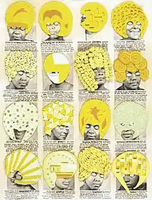 Themes related to race are often evident in Gallagher's work, sometimes using pictographs, symbols, codes and repetitions. "Sambo lips" and "bug eyes," references to the Black minstrel shows, are often scattered throughout Gallagher's works. Additionally, Gallagher would use these symbols in her collage pieces, inspired by lined yellow paper schoolchildren use.[5] Certain characters are also used repeatedly, such as the image of the nurse or the "Pegleg" character that sometimes populate her page's iconography. Gallagher made Wiglette from Deluxe 2004 to 2005, which contains a collection of vintage beauty ads from the 1930s to 70s intended for black American women. Through this art piece Ellen Gallagher is once again exploring the intersection of identity, race and culture.[19] When asked about Wiglette in an interview Gallagher said, “The wig ladies are fugitives. Conscripts from another time and place, liberated from the 'race' magazines of the past. But I transformed them-here on the pages that once held them captive.” [20] Some of her pieces may explicitly reference the issue of race while also having a more subtle undercurrent related to race.[21] She was inspired by the New Negro movement as well as modernist abstraction.[7] Gallagher also uses found historical images in her work.[22] She combines formality (grid lines, ruled paper) with the racial stereotypes to depict the "ordering principles" society imposes.[23]