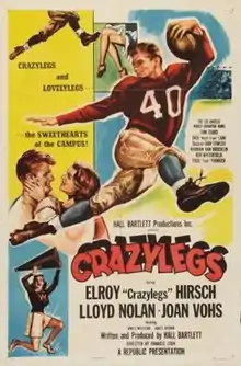- Crazylegs, a motion picture released in November 1953 focusing on Hirsch's life as a football player at Wausau High School and the Universities of Wisconsin and Michigan. Hirsch played himself as the lead in the film.[61][62] Los Angeles Times movie critic John L. Scott wrote of Hirsch's performance: "Hirsch as an actor is both likable and believable. He does very well in his first film assignment."[6] Hirsch's appearance in Crazylegs has been credited with expanding his fame beyond sports fans and making him "a star in the eyes of the general public."[63]