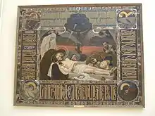 The Epitaphios (Greek: Ἐπιτάφιος, epitáphios, or Ἐπιτάφιον, epitáphion, meaning "above the tomb"; Slavonic: Плащаница, plashchanitsa; Arabic: نعش, naash) is a Christian religious icon, typically consisting of a large, embroidered and often richly adorned cloth, bearing an image of the dead body of Christ, often accompanied by his mother and other figures, following the Gospel account. It is used during the liturgical services of Good Friday and Holy Saturday in the Eastern Orthodox and Byzantine Catholic churches, as well as some Oriental Orthodox Churches. It also exists in painted or mosaic form, on wall or panel.