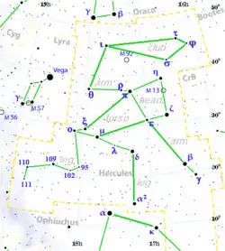 Epsilon Herculis, Latinized from ε Herculis, is a fourth-magnitude multiple star system in the northern constellation of Hercules. The combined apparent visual magnitude of 3.9111[1] is bright enough to make this system visible to the naked eye. Based upon an annual parallax shift of 21.04 mas as seen from Earth,[1] it is located 155 light years from the Sun. The system is moving closer to the Sun with a radial velocity of −25 km/s.[11]