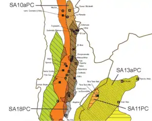 The Escondida deposit is one of a cluster of porphyry coppers in an elongated area about 18 km north–south and 3 km east–west[2] and is associated with the 600 km long West Fissure (Falla Oeste) system, which is in turn associated with most of the major Chilean porphyry deposits. A barren, leached cap, in places up to 300 metres thick, overlies a thick zone of high grade secondary supergene mineralisation of the main orebody, largely chalcocite and covellite, which in turn overlies the unaltered primary mineralisation of chalcopyrite, bornite and pyrite.[3]