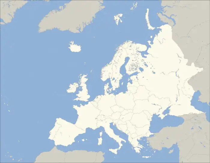 Clickable map of Europe, showing one of the most commonly used continental boundaries[u]