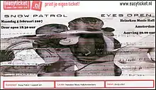After the secret gigs and the KOKO show, Snow Patrol kicked off touring for Eyes Open by undertaking a small European tour.[68] The tour included an acoustic show by Lightbody and Connolly for Dutch channel 3VOOR12.[69]
