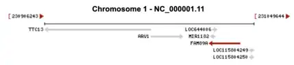 The gene FAM89A is a protein-encoding gene in humans, located on minus strand of chromosome 1, map position 1q42.2. It is also known as chromosome 1 open reading frame 153 (C1orf153).[7][8][9] The primary mRNA transcript for the FAM89A gene is 1,503 base pairs in length.[10] There are no other transcript variants for FAM89A. The gene is composed of two exons flanking one large intronic region.[11] FAM89A is neighboring the genes TRIM67 (Tripartite Motif Containing 67), located downstream of FAM89A on the plus strand of chromosome 1, and ARV1 (ARV1 Homolog, Fatty Acid Homeostasis Modulator), located upstream of FAM89A on the plus strand of chromosome 1.[11][12]