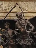 As an image, "Father Time's origins are curious."[1] The ancient Greeks themselves began to associate chronos, their word for time, with the god Chronos, who had the attribute of a harvester's sickle. The Romans equated Cronos with Saturn, who also had a sickle, and was treated as an old man, often with a crutch. The wings and hourglass were early Renaissance additions and he eventually became a companion of the Grim Reaper, personification of Death, often taking his scythe. He may have as an attribute a snake with its tail in its mouth, an ancient Egyptian symbol of eternity.[2]