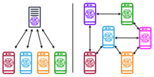 The way the statistical local outputs are pooled and the way the nodes communicate with each other can change from the centralized model explained in the previous section. This leads to a variety of federated learning approaches: for instance no central orchestrating server, or stochastic communication.[13]