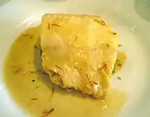 The traditional preparation is to roast or grill the whole pieces of fish over high heat.[1] Finnan haddie is also often served poached in milk for breakfast[10] and is an important part of traditional kedgeree and the Arnold Bennett omelette.[11]