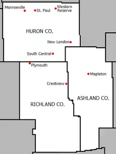 The Firelands Conference is an Ohio High School Athletic Association (OHSAA) athletic league located in north-central Ohio. The league was formed in the 1960–61 school year and is named for the Firelands area of the old Western Reserve, where most of the member schools reside.[1] High schools in this conference are located in Ashland, Huron, and Richland counties. Some of the schools' district boundaries extend into the neighboring counties of Crawford, Erie, and Lorain. Most of the founding schools came from the defunct Huron-Erie League.