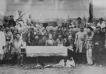 Rebellion broke out on the night of 4 April 1931, with a massacre of Chang and his 32 soldiers at the wedding ceremony; 100 Han Chinese families of refugees from Gansu also were killed, altogether with Chinese garrisons in outposts at villages Tu-lu-Hu and Lao-mao-hu near Kumul.[4] It was not confined to the ethnic Uyghur population alone; Kazakhs, Kyrgyz, Han and Hui commanders all joined in revolt against Jin's rule, though they would occasionally break to fight one another.