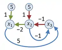 Using the examples from the subsection Elements of signal-flow graphs, we construct the graph In the figure, a signal-flow graph in this case. To check that the graph does represent the equations given, go to node x1. Look at the arrows incoming to this node (colored green for emphasis) and the weights attached to them. The equation for x1 is satisfied by equating it to the sum of the nodes attached to the incoming arrows multiplied by the weights attached to these arrows. Likewise, the red arrows and their weights provide the equation for x2, and the blue arrows for x3.