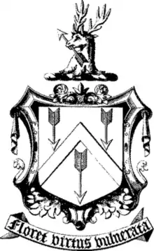 Arms of Floyer of Floyer Hayes: Sable, a chevron between three arrows points downward argent; crest: A stag's head erased or holding in the mouth an arrow argent.[7] Motto: Floret Virtus Vulnerata ("Virtue flourishes wounded")