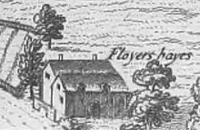 No remains of the manor house survived beyond about 1830 or 1840. It stood set back a little way on the east side of the road from Exeter to Alphington, between the Haven Road and the railway viaduct, rather beyond what was known in 1898 as Sydney Place.[4] The name "Flower Pot Buildings" may have been originally "Floyer's Plot." The land lies very low, and was intersected by streams by which mills are worked. A mill is mentioned as being on the manor of Floyer's Hayes in the time of Henry III (1216–1272). Many open spaces around the outside of the City walls are shown on the 1765 map of Exeter by Benjamin Donnas as suffixed "Hay", such as Shill Hay, Southern Hay, Northern Hay, Fryers Hay and Bon Hay. The manor house is shown on a 1573 map of Exeter[5] as a building of large size, surrounded by a stone wall and entered beneath a large arched gateway.[4] According to Worthy (1892): "It stood nearly in a line with "Snayle Tower", and on the west side of the river, and must have been very near the ancient priory of Cowick, but a little to the south-west of it".