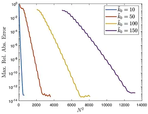 We introduce the dimensionless frequency , where is the length of the plate. The figure below shows the convergence of the method for various . Here is the number of basis functions used to approximate the jump across the plate. The maximum relative absolute error is the maximum error of the computed solution divided by the maximum absolute value of the solution. The figure is for and shows the quadratic-exponential convergence of the method, namely the error decreases like for some positive . More complicated geometries (including different angles of touching boundaries and infinite wedges) can also be dealt with in a similar fashion as well as more complicated boundary conditions such as those modeling elasticity.[8][9]