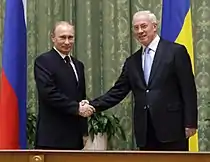 During the 2004 Ukrainian presidential election, Putin twice visited Ukraine before the election to show his support for Ukrainian Prime Minister Viktor Yanukovych, who was widely seen as a pro-Kremlin candidate, and he congratulated him on his anticipated victory before the official election results had been in.[26][27] Putin's personal support for Yanukovych was criticized as unwarranted interference in the affairs of a sovereign state (See also The Orange revolution). Crises also developed in Russia's relations with Georgia and Moldova, both former Soviet republics accusing Moscow of supporting separatist entities in their territories.