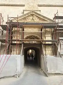 After the siege, Maltese military engineer Girolamo Cassar drew up plans to reduce Mdina's size by half and turning it into a fortress, but these were never implemented due to protests by the city's nobles.[20] The city's main gate was reconstructed in the early 17th century, but the next major alterations were not made until the 1650s, when the large De Redin Bastion was built at the centre of the land front.[21] Despite these modifications, by 1658 there were also proposals to abandon or demolish the entire fortress due to its state of disrepair, although these plans were opposed by the locals.[22] In the late 17th century, some of Mdina's medieval double walls began to be encased in sloping ramparts.[23]