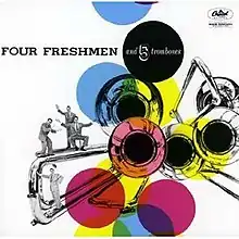 Four Freshmen and 5 Trombones is a 1956 album by The Four Freshmen[1] "It reached number six nationally and resided on the charts for over eight months."[2] It was the first album bought by Brian Wilson, who would be greatly influenced by the Four Freshmen when starting The Beach Boys.[3] Later, the Four Freshmen were acclaimed as "the most innovative and imitated jazz vocal quartet ever to grace vinyl". Straddling vocal jazz and pop music, they were inducted into the Vocal Group Jazz Hall of Fame in 2001.[2]
