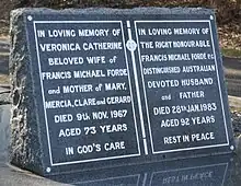 Forde was widowed in November 1967.[40] During the years that he spent in Ottawa as High Commissioner to Canada two of his daughters (Mary and Mercia) became married to Canadians. Mary (m. William Robert Thompson) eventually settled with her husband in Kingston, Ontario, Canada while Mercia (m. Ian Ferrier) returned to Australia and settled with her husband in St. Lucia, Brisbane. Francis Gerald Forde (m. Leneen Forde) also settled in St. Lucia, while Clare (m. John Attridge) settled in Canberra. Between their four children, Frank and Vera Forde had 15 grandchildren.