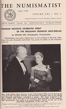 Mint Director Nellie Tayloe Ross had long been an admirer of Benjamin Franklin, and wished to see him on a coin.[2] In 1933, Sinnock had designed a medal featuring Franklin, which may have given her the idea.[2] Franklin had opposed putting portraits on coins;[3] he advocated proverbs about which the holder could profit through reflection.[4] In a 1948 interview, Ross noted that Franklin only knew of living royalty on coins, and presumably would feel differently about a republic honoring a deceased founder.[3] Indeed, Franklin might have been more upset at the reverse design: as numismatic writer Jonathan Tepper noted, "Had Benjamin Franklin known that he would be appearing on a half dollar with an eagle, he most likely would have been quite upset. He detested the eagle, and numismatic lore has it that he often referred to it as a scavenger. Given the practical man that he was, Franklin proposed the wild turkey as our national bird."[5]