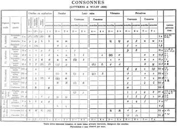 - (in Swedish) Lindblad, Göran. 1925. Svensk biografisk handbok, p. 832Chart of Wulff's phonetic transcription system from 1888. Many of the symbols would end up being used by the International phonetic alphabet (IPA), but others, such as Greek τ δ ν for dental [t̪ d̪ n̪] and π μ for [p̪ m̪], would not be. Script and rotated letters would be used by the IPA, but not bold or italic typeface. This system includes a level of phonetic detail in its letters that the IPA transcribes with diacritics.