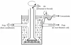Diagram of froth flotation cell. Numbered triangles show direction of stream flow. A mixture of ore and water called pulp [1] enters the cell from a conditioner, and flows to the bottom of the cell. Air [2] or nitrogen is passed down a vertical impeller where shearing forces break the air stream into small bubbles. The mineral concentrate froth is collected from the top of the cell [3], while the pulp [4] flows to another cell.