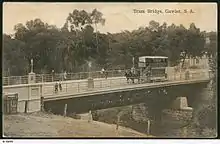 Gawler's horse-drawn tram service opened in 1879. It operated for both goods and passengers from the railway station along what is now Nineteenth Street (then known as part of Murray Street) and Murray Street (the town's main street) to a terminus near where the Gawler Central station is now. It passed the James Martin & Co engineering factory, providing a convenient way to deliver heavy equipment such as locomotives manufactured there. Broad gauge locomotives were taken directly on the tramway, narrow gauge were transported on specially-built flat-bed trucks.[19] There were also sidings at May Brothers and Company, Roedigers, and Dowson's Mill.[20] The tram closed in 1931 replaced by a bus, and the tracks lifted soon after.[21][9]