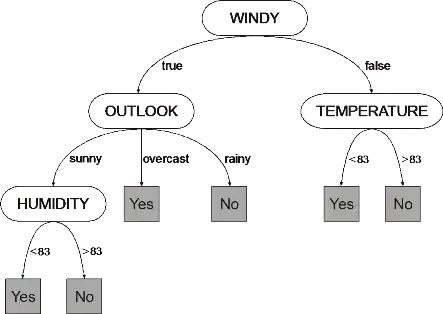 where “H” represents the attribute Humidity, “O” the attribute Outlook, “W” represents Windy, and “a” and “b” the class labels "Yes" and "No" respectively. Note that the edges connecting the nodes are properties of the data, specifying the type and number of branches of each attribute, and therefore don't have to be encoded.