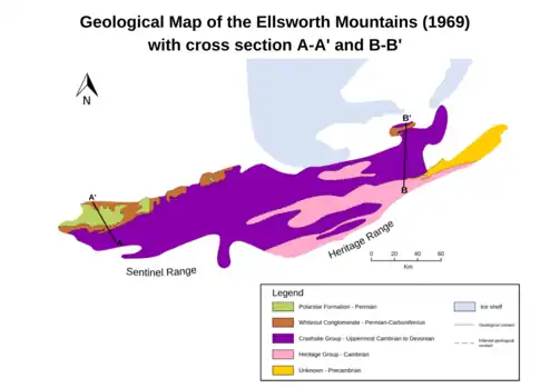 The Ellsworth Mountains display a 13-kilometre (8 mi) thick geologic sequence of Paleozoic sedimentary and volcanic rocks.[2] The Lower to Upper Cambrian Heritage Group is part of the lower Paleozoic series old rock strata.[2] The uppermost Cambrian to Devonian Crashsite Group makes up the middle portion of the geologic sequence,[2] while the Permian-Carboniferous Whiteout Conglomerate and Permian Polarstar Formation make up the remaining upper portion.[5]