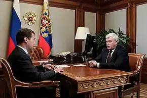 - ↑ "Президент выбрал на пост губернатора Санкт-Петербурга своего полпреда в ЦФО и дал ему задания" [The President chose his plenipotentiary in the Central Federal District for the post of governor of St. Petersburg and gave him tasks]. Archived from the original on 18 July 2014. Retrieved 30 August 2011.