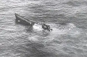 The U-boat, now under the command of Oberleutnant zur See Siegfried Straub, left Brest on 29 February 1944 on her tenth and final patrol.[17] On 10 March, west of Ireland, in position 52°35′N 20°19′W / 52.583°N 20.317°W, she was sunk by depth charges from a Canadian Sunderland patrol bomber EK591 "2U" from No. 422 Squadron RCAF. All 53 hands were lost.[1] "The crew of the Canadian amphibious plane, the Sunderland, reported that it had sunk a German U-boat off the west coast of Ireland and that the crew were swimming around in the water. Pictures of the attack & sinking of U-625, and of some of the crew that escaped in liferafts (not all), were taken by the cameras aboard the Sunderland. The plane circled a few times and headed back to its home base. None of the submarine crew survived; before having a chance to be rescued, they were lost in high seas. Those pictures hung in the office of Sir Winston Churchill for a period during the war; it was the only confirmed proof of a U-boat "kill" by a Canadian coastal squadron during World War II. U-625 was one of 543 German ships that went lost together with its entire crew" (Neitzel & Welzer 2012:261, with two photos on p. 262 of U-625 being attacked and about half of the crew clustered together in the water in one-man rafts.)
