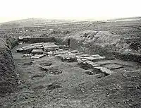 A paved road, delimited by vertical slab stones, runs parallel to the latter mortuary area. The construction of the road is supposed to be contemporary to the monumentalization of the necropolis.[35] The Bedini excavations have unearthed an area containing thirty two slab-cist tombs, made of a stone different from the one used in the serpentine-shaped area.[35] The cist tombs were mostly without their cover slabs, as these were wrecked during centuries of agricultural activities in the area. This so-called "Bedini's area" appears to have undergone three phases of development: